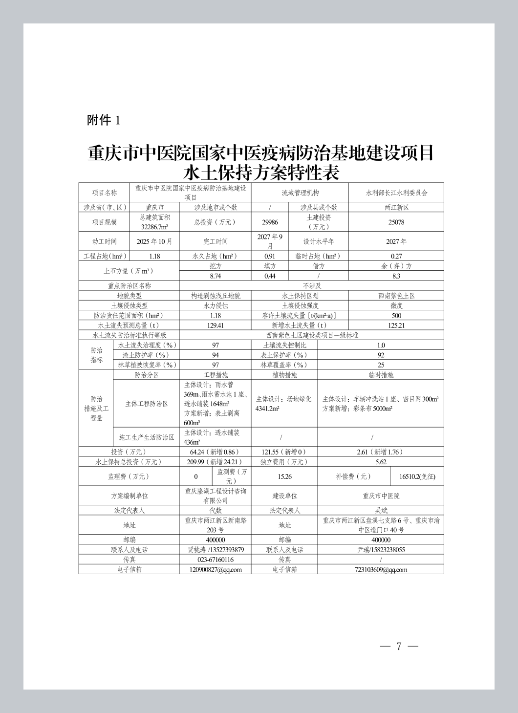 附件:1.重庆市中医院国家中医疫病防治基地建设项目水土保持方案特性表