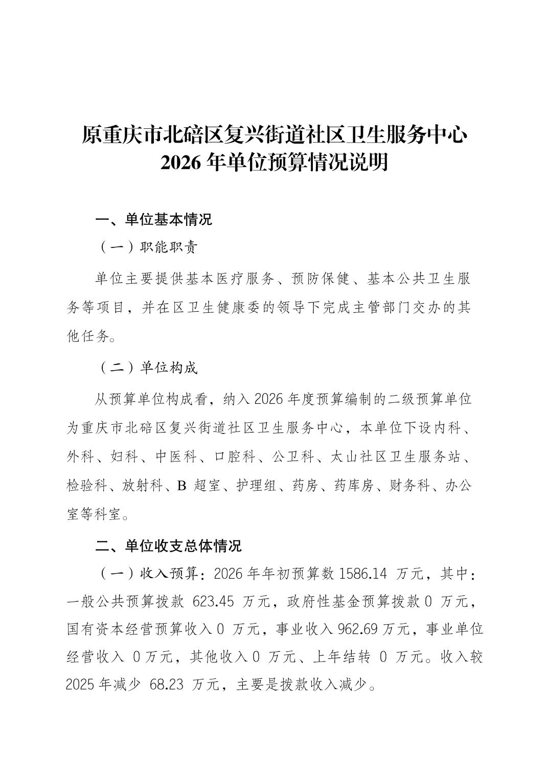 原重庆市北碚区复兴街道社区卫生服务中心2026年单位预算情况说明