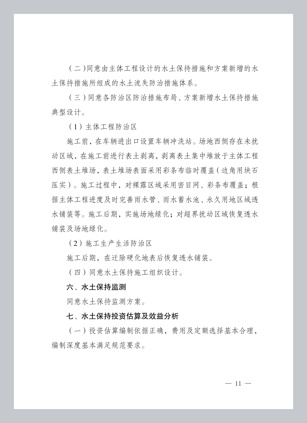 (六)本方案批准后,项目的地点、规模、水土保持措施等发生重大变更,符合“水利部第53号令”第十六条明确的情形,应当补充或者修改水土保持方案,报我局审批。确需在水土保持方案确定的弃渣场以外新设弃渣场的,或者因弃渣量增加导致弃渣场等级提高的,生产建设单位应当开展弃渣减量化、资源化论证,在弃渣前编制水土保持方案补充报告,并报我局审批。