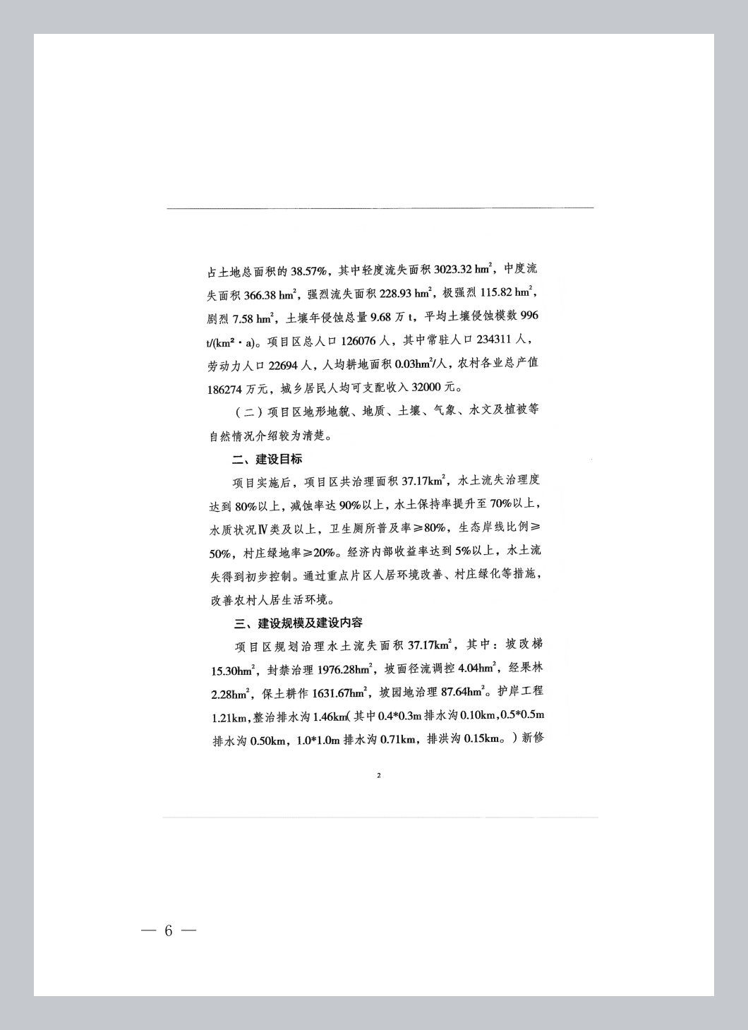 原批复:项目治理水土流失面积40.18km2,建设内容包括:封禁治理1710.53hm2,封禁治理碑9座;坡改梯33.65hm2(其中石坎坡改梯30.22hm2,土坎坡改梯3.43hm2),坡面径流调控34.15hm2,新建排水沟4.74km(其中新建0.3×0.3m排水沟0.34km,新建0.5×0.5m排水沟2.15km,新建0.7×0.6m排水沟2.25km;沉沙凼20个),保土耕作2525.96hm2,坡园地治理24.54hm2。新修机耕道1.71km(路宽4.0m),作业便道1.12km(路宽2.5m),沟带路1.88km(路宽0.8m沟0.3×0.3m),生产路4.52km(其中0.9m宽3.78km,1.5m宽0.74km)。涵洞11个,交接口3个,错车道3个,堡坎0.05km。集中村庄绿化8处(新建绿化篱笆0.50km),护岸工程1.80km。配套水土保持宣传牌8个,小流域工程碑1座,安全警示牌10个。
