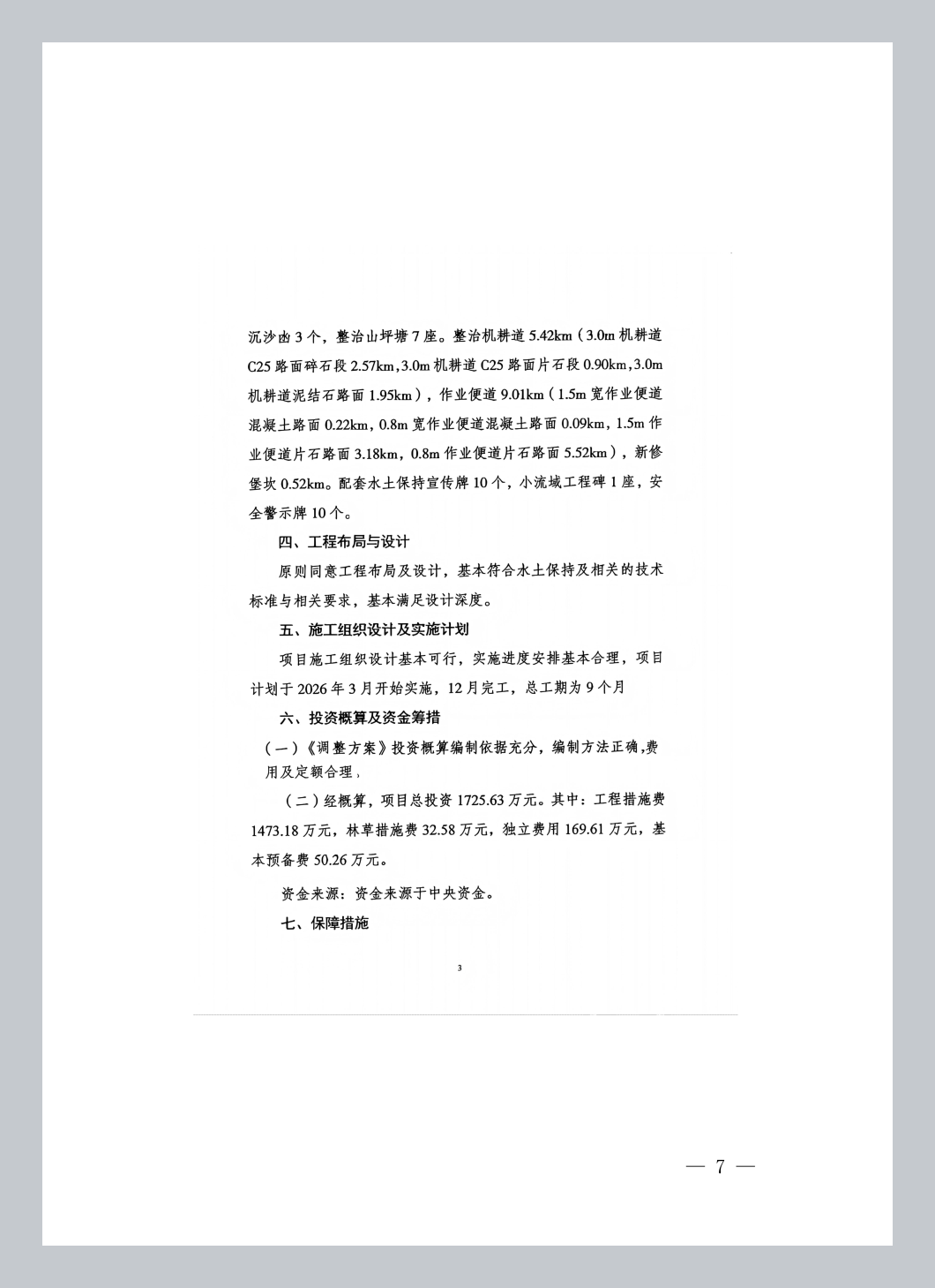 调整后:工程建设总投资1725.63万元,其中:工程措施费1473.18万元,林草措施费32.58万元,独立费用169.61万元,基本预备费50.26万元,资金来源全部为中央资金。