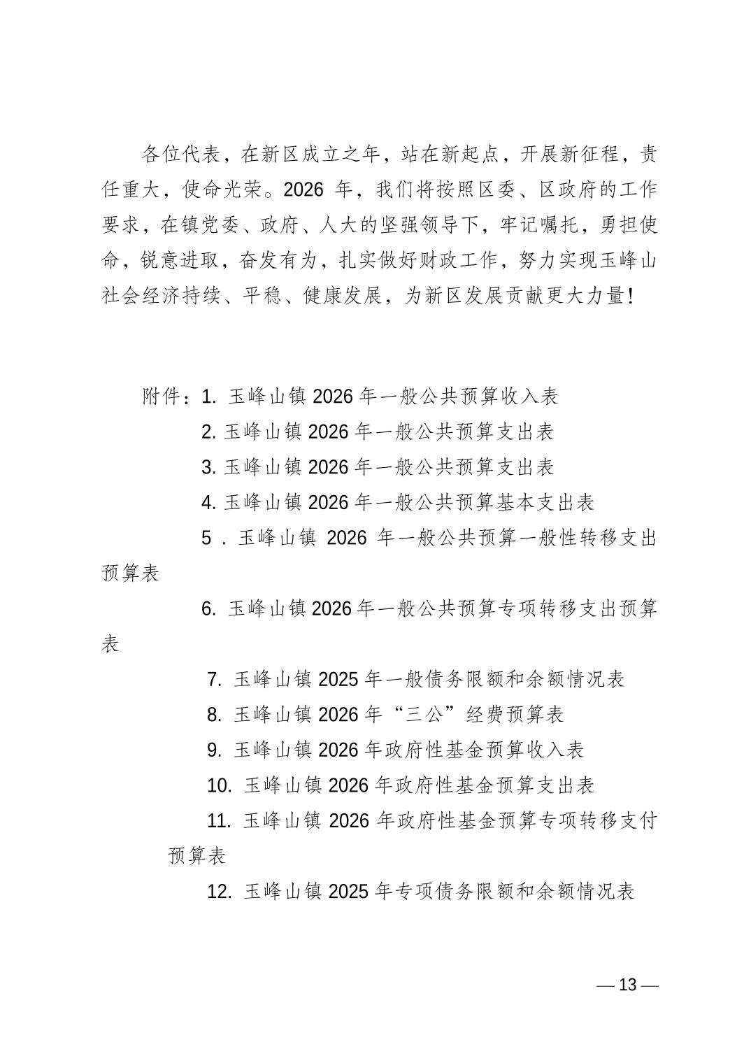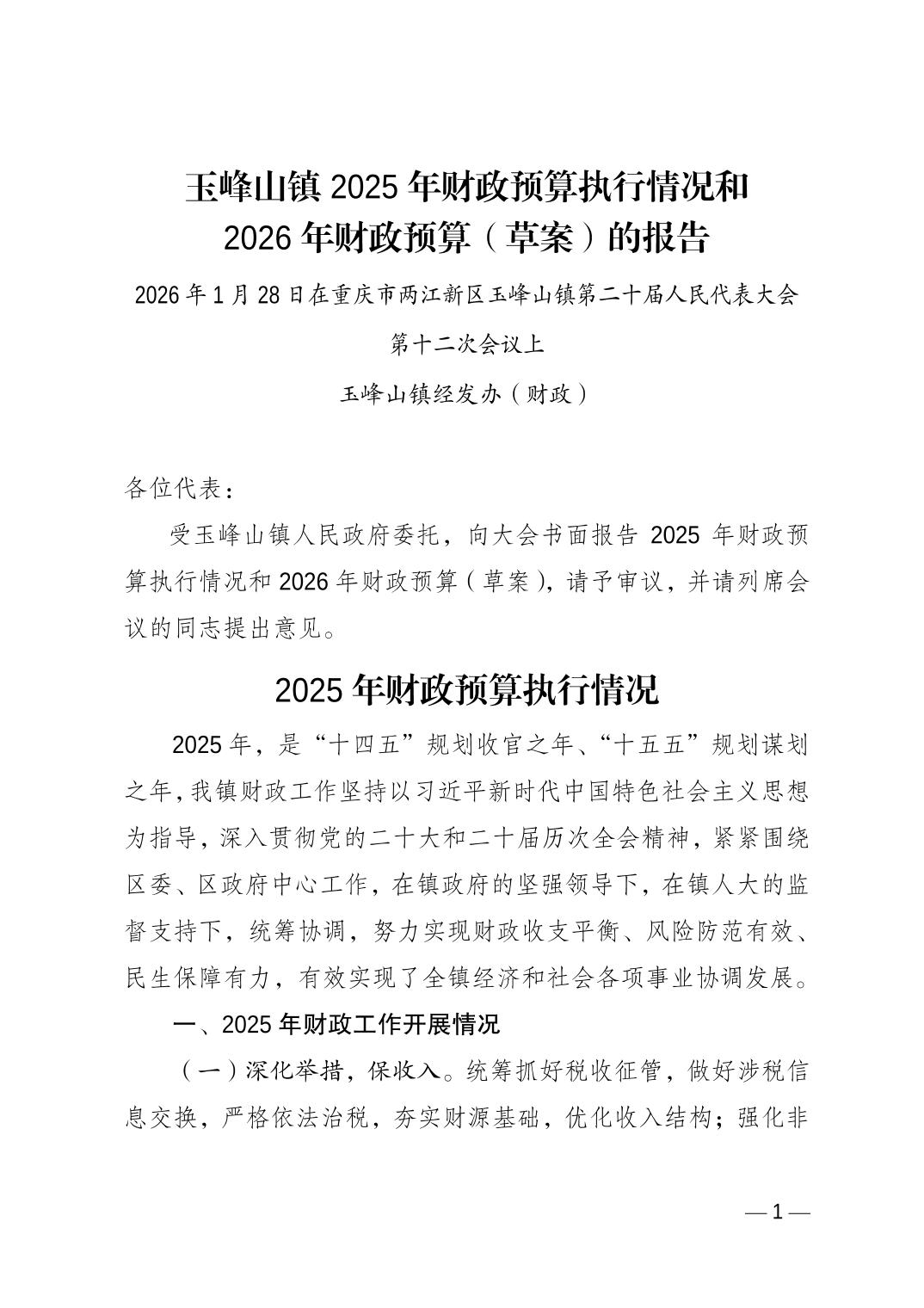 2025年财政预算执行情况和2026年财政预算(草案)的报告(2026.01.29预算公开版).pdf 重庆市两江新区玉峰山镇2026年政府预算编制情况补充说明(万元).doc 重庆市两江新区玉峰山镇2026年政府预算收支公开表 - 副本.xls