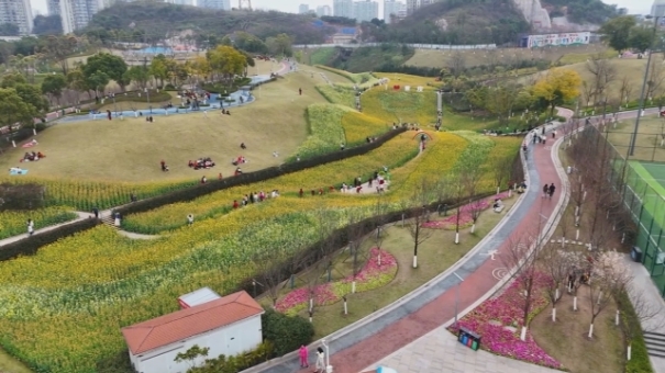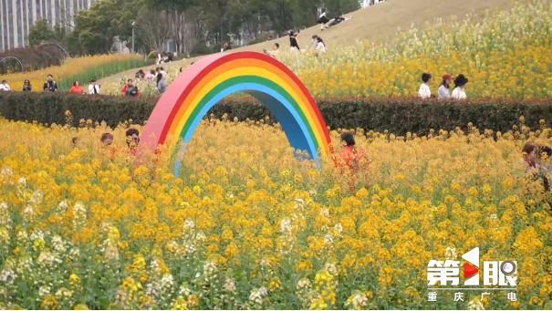随着气温回暖,山城春意渐浓。两江新区溉澜溪体育公园里,一片面积达2.1万平方米的油菜花海迎来盛放。不过,这片油菜花田可不是常见的一片金黄。