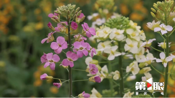 现场工作人员赵轶介绍说,“我们公园从入口区域,最开始呈现的就是橙黄色的油菜花,这种油菜花要比普通的油菜花颜色更加艳丽,向内延伸就是经过改良的桃色花海,往前面走就是混播区,有乳白、淡紫还有橙黄交织在一起,更有文艺清新的感觉。”