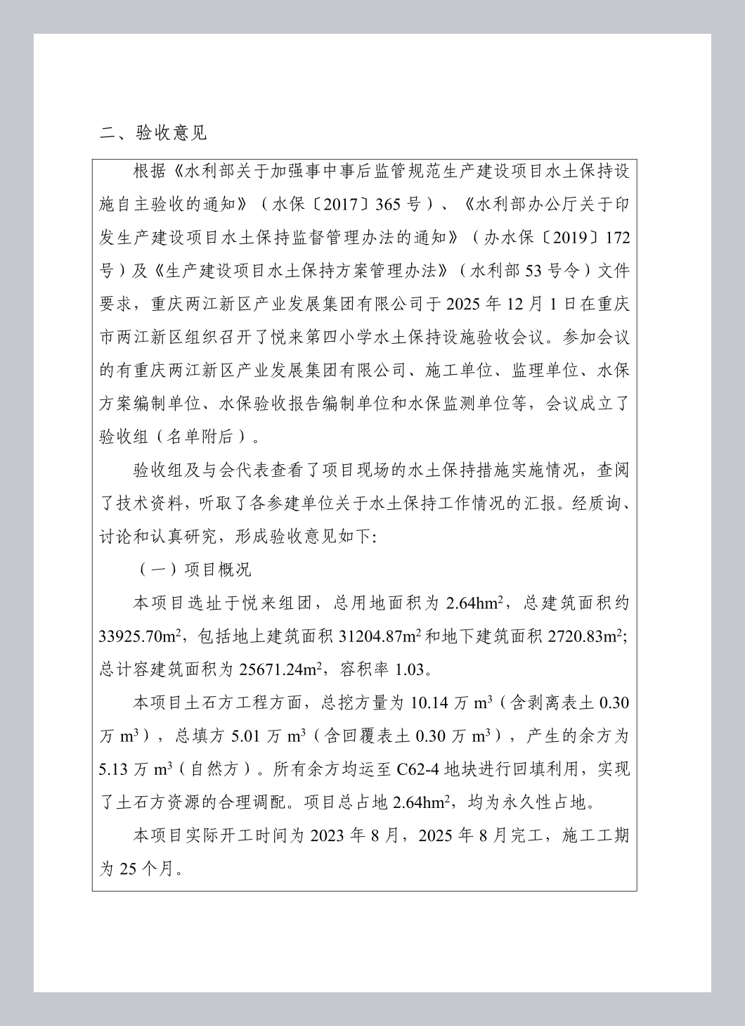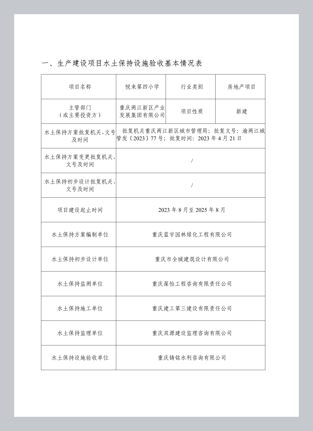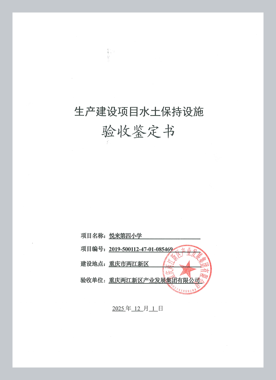 经审核,悦来第四小学水土保持设施已经重庆两江新区产业发展集团有限公司验收合格,水土保持设施自主验收资料符合格式规定,并已在水保验收公示网上向社会公开,同意接受报备并予公告。