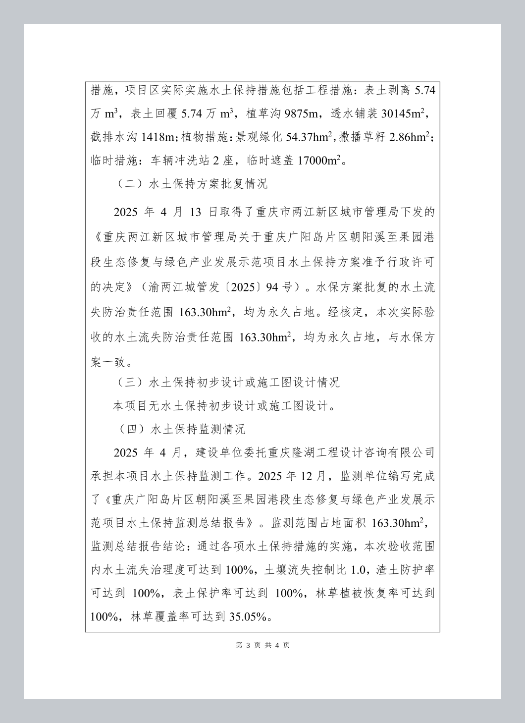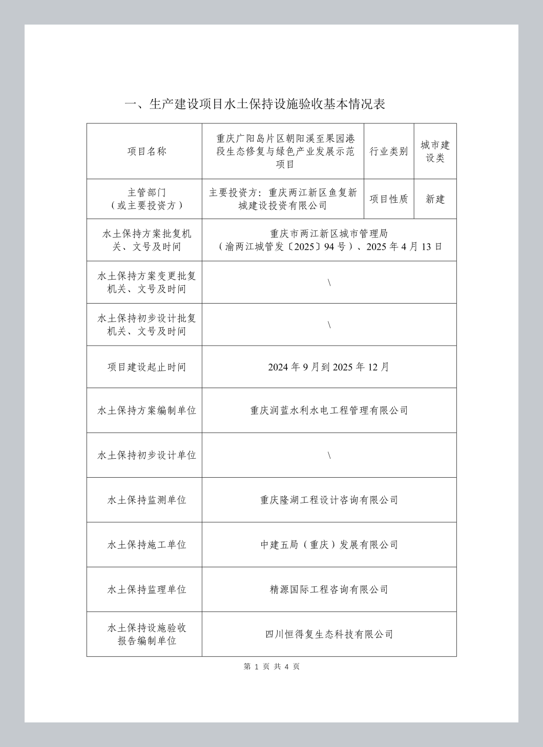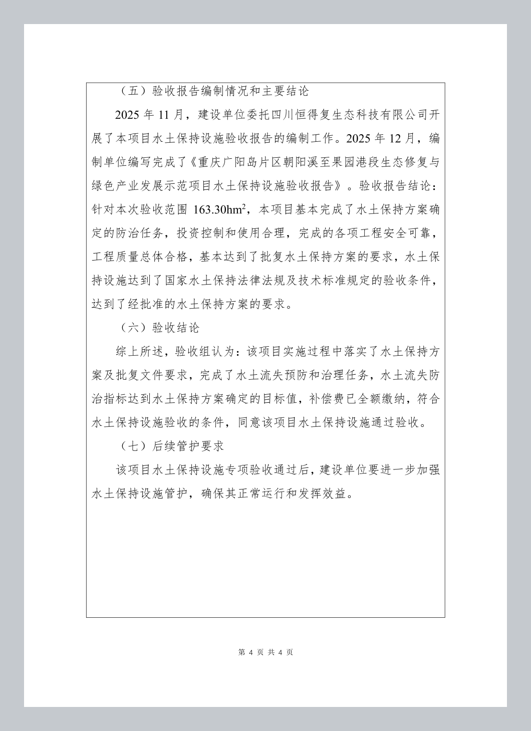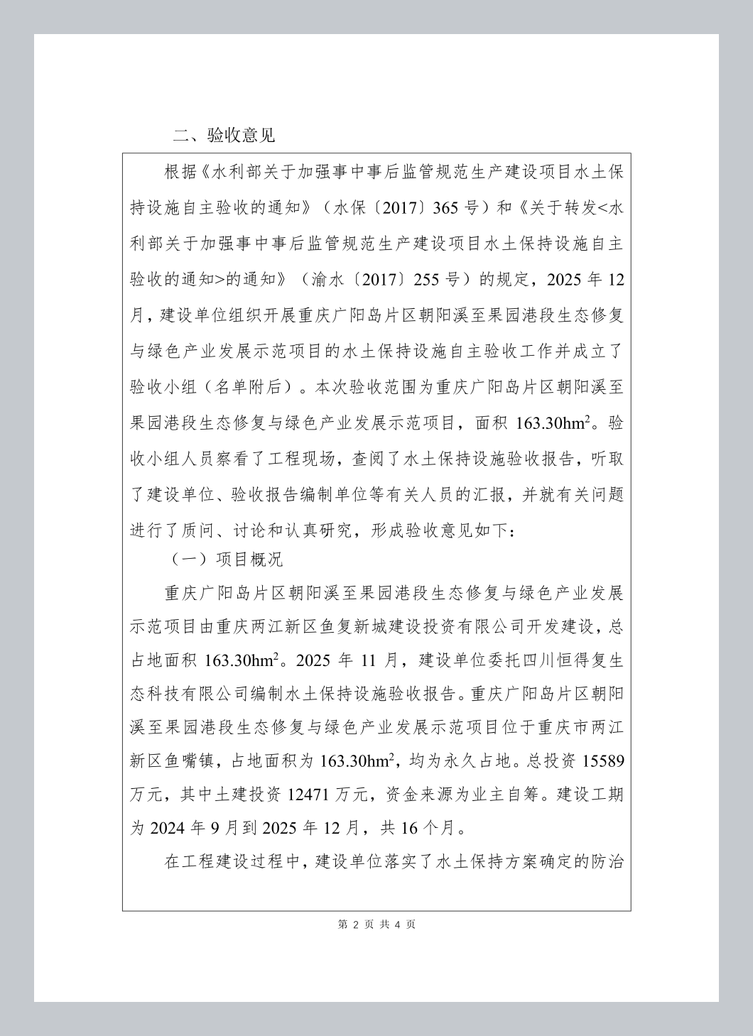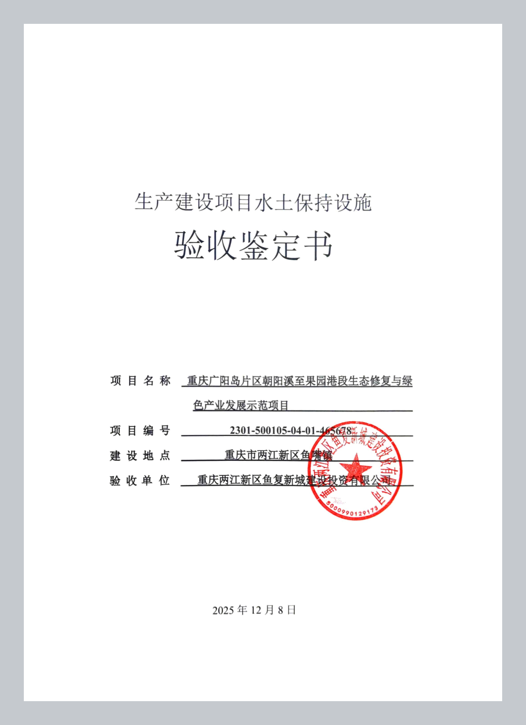 经审核,重庆广阳岛片区朝阳溪至果园港段生态修复与绿色产业发展示范项目水土保持设施已经重庆两江新区鱼复新城建设投资有限公司验收合格,水土保持设施自主验收资料符合格式规定,并已在水保验收公示网上向社会公开,同意接受报备并予公告。