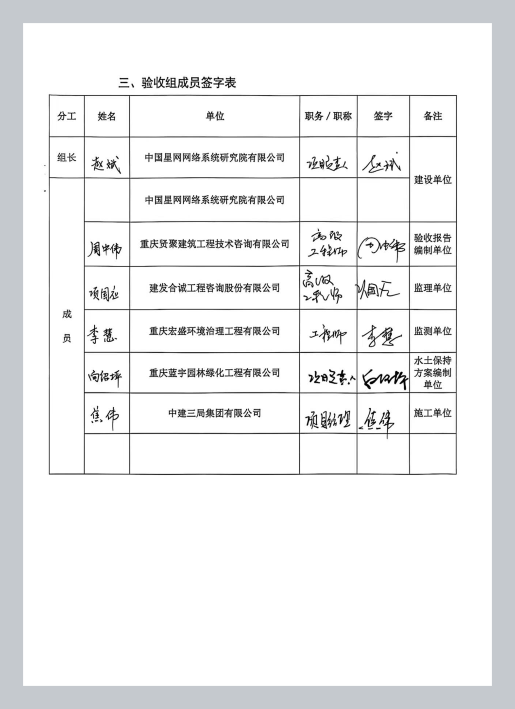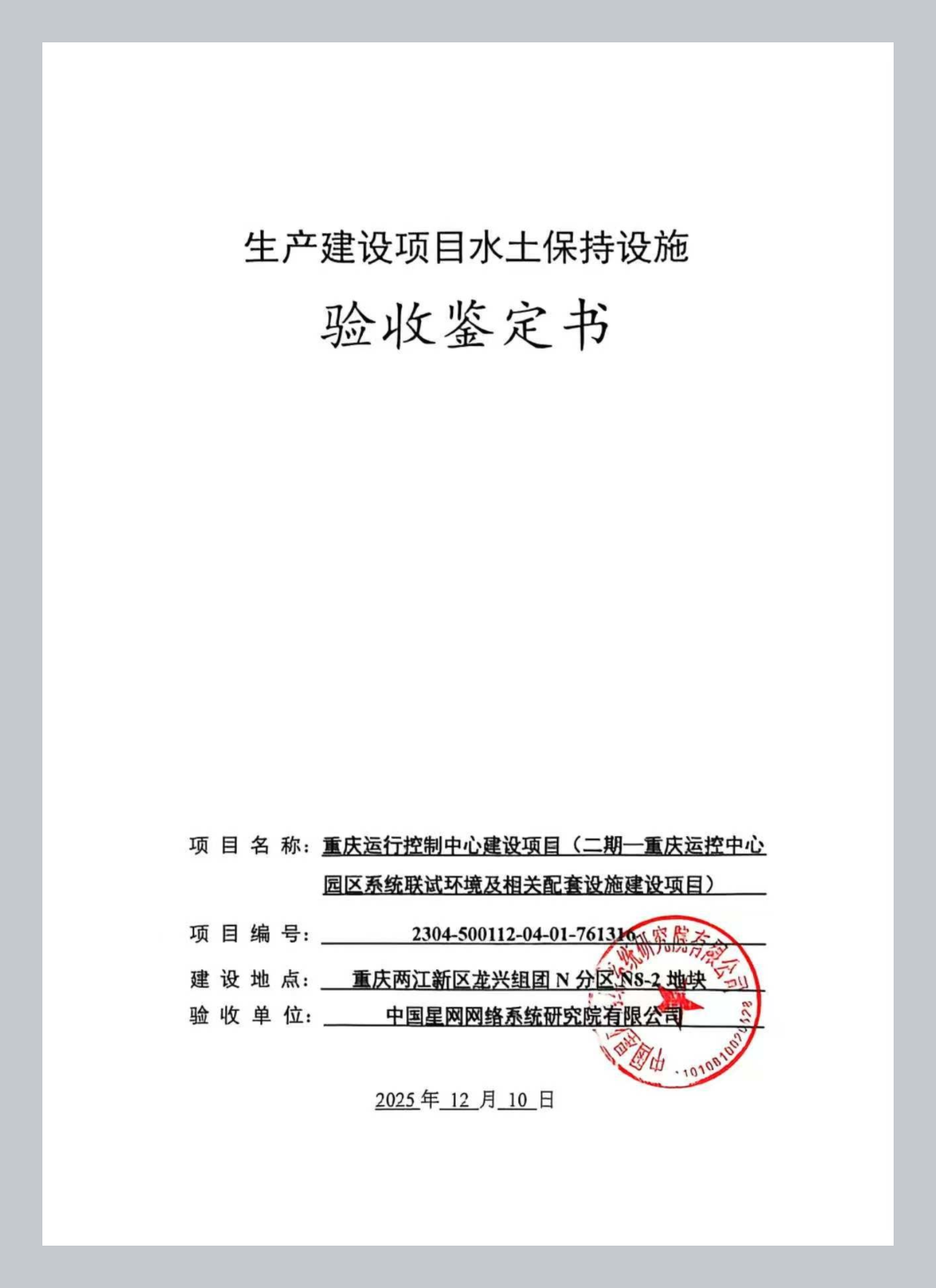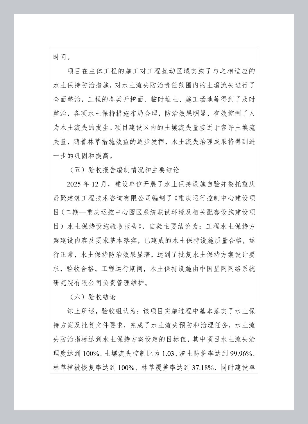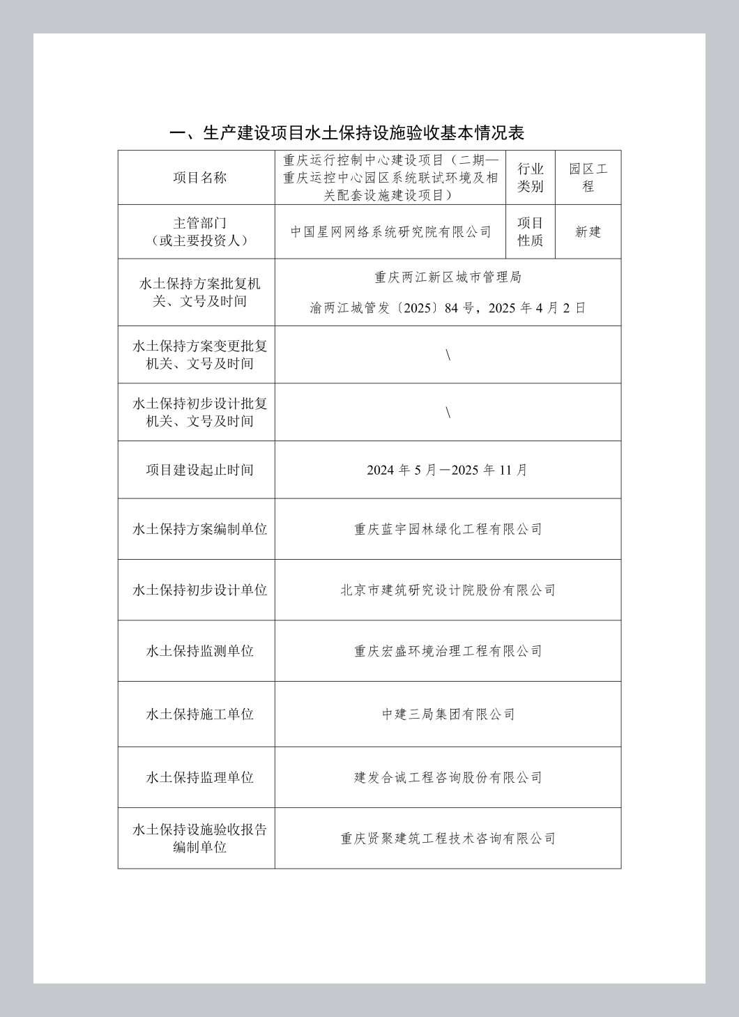 经审核,重庆运行控制中心建设项目(二期一重庆运控中心园区系统联试环境及相关配套设施建设项目)水土保持设施已经中国星网网络系统研究院有限公司验收合格,水土保持设施自主验收资料符合格式规定,并已在水土保持公示网上向社会公开,同意接受报备并予公告。