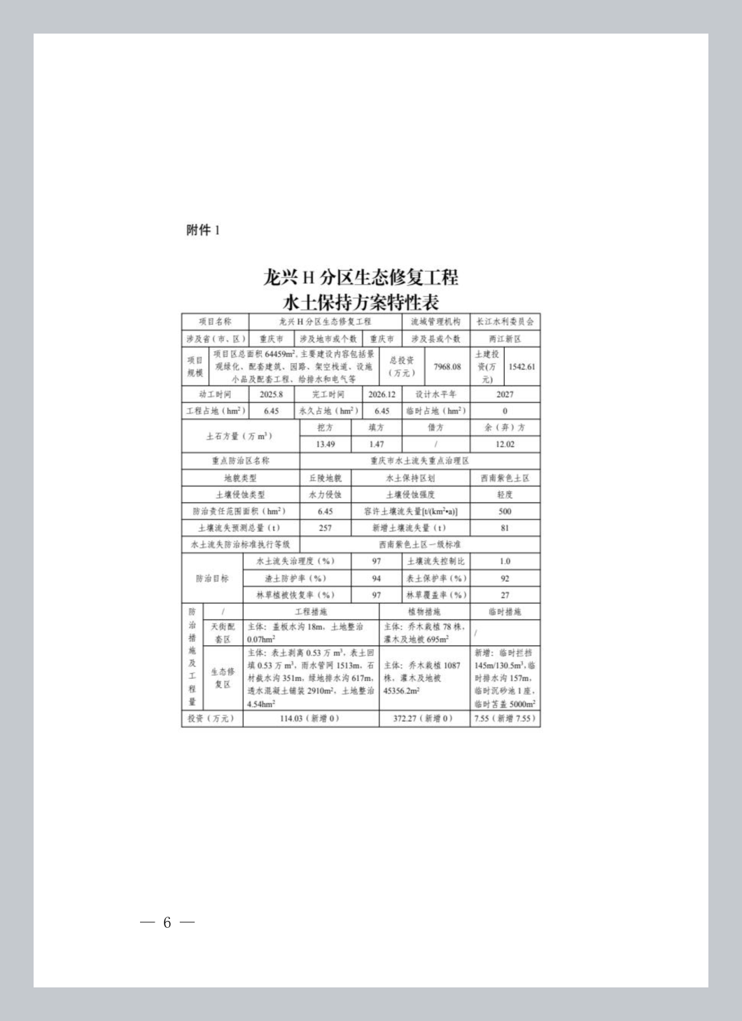 附件:1.龙兴H分区生态修复工程水土保持方案特性表