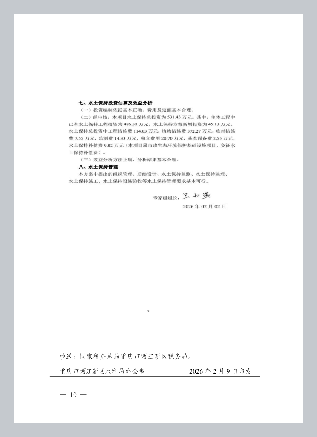 经审核,本项目水土保持总投资为531.43万元。其中,主体工程中已有水土保持工程投资为486.30万元,水土保持方案新增投资为45.13万元。水土保持总投资中工程措施费114.03万元,植物措施费372.27万元,临时措施费7.55万元,监测费14.33万元,独立费用20.70万元,基本预备费2.55万元,水土保持补偿费9.02万元(本项目属市政生态环境保护基础设施项目,免征水土保持补偿费)。
