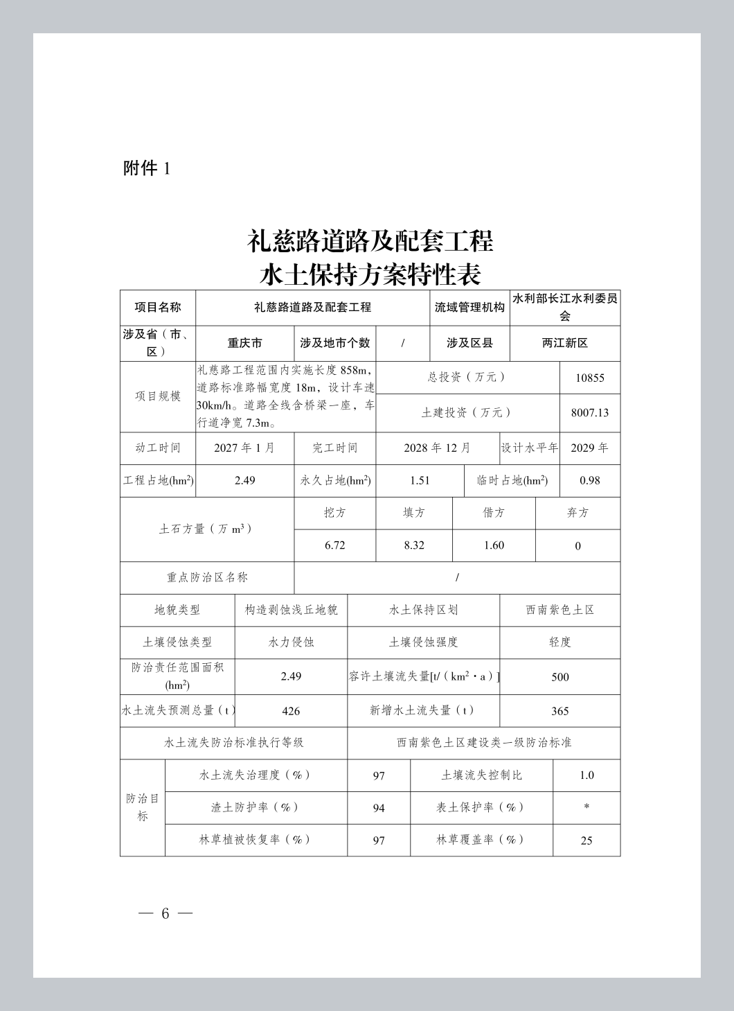 附件:1.礼慈路道路及配套工程水土保持方案特性表