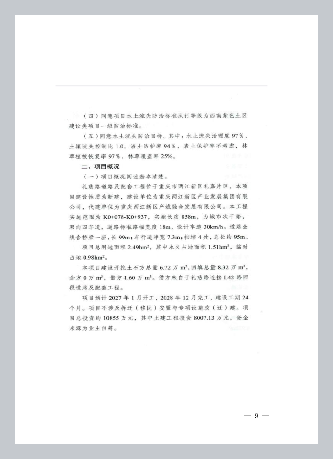 礼慈路道路及配套工程位于重庆市两江新区礼嘉片区,本项目建设性质为新建,建设单位为重庆两江新区产业发展集团有限公司,代建单位为重庆两江新区产城融合发展有限公司。本工程实施范围为K0+078-K0+937,实施长度858m,为城市次干路,双向四车道,道路标准路幅宽度18m,设计车速30km/h。道路全线含桥梁一座,长99m;车行道净宽7.3m;挡墙4处,总长约95m。项目总用地面积2.49hm2,其中永久占地面积1.51hm2,临时占地0.98hm2。