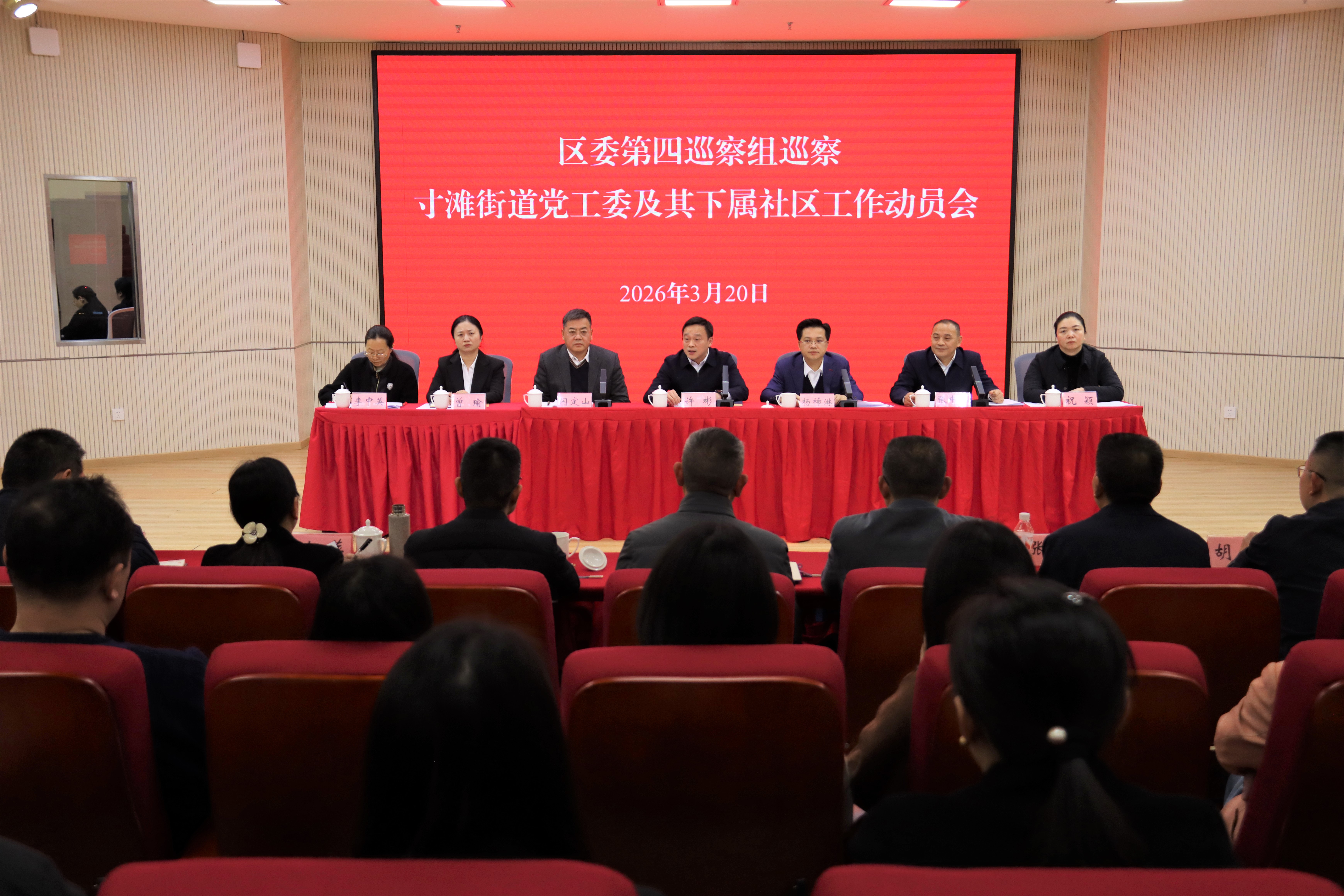 根据区委关于巡察工作的统一安排,2026年3月20日下午,区委第四巡察组巡察寸滩街道党工委及其下属社区工作动员会召开。会前召开了与寸滩街道党工委主要负责人的见面沟通会,区委组织部副部长(主持日常工作)、区委巡察工作领导小组成员杨稀淋传达了中央、市委和区委有关巡视巡察工作的部署要求。会上,杨稀淋同志就开展好巡察工作作动员讲话,区委第四巡察组组长闪定山通报巡察的重点任务和总体安排,两路果园港综合保税区党工委委员、管委会副主任许彬提工作要求,寸滩街道党工委主要负责人张中举主持会议并作表态发言。