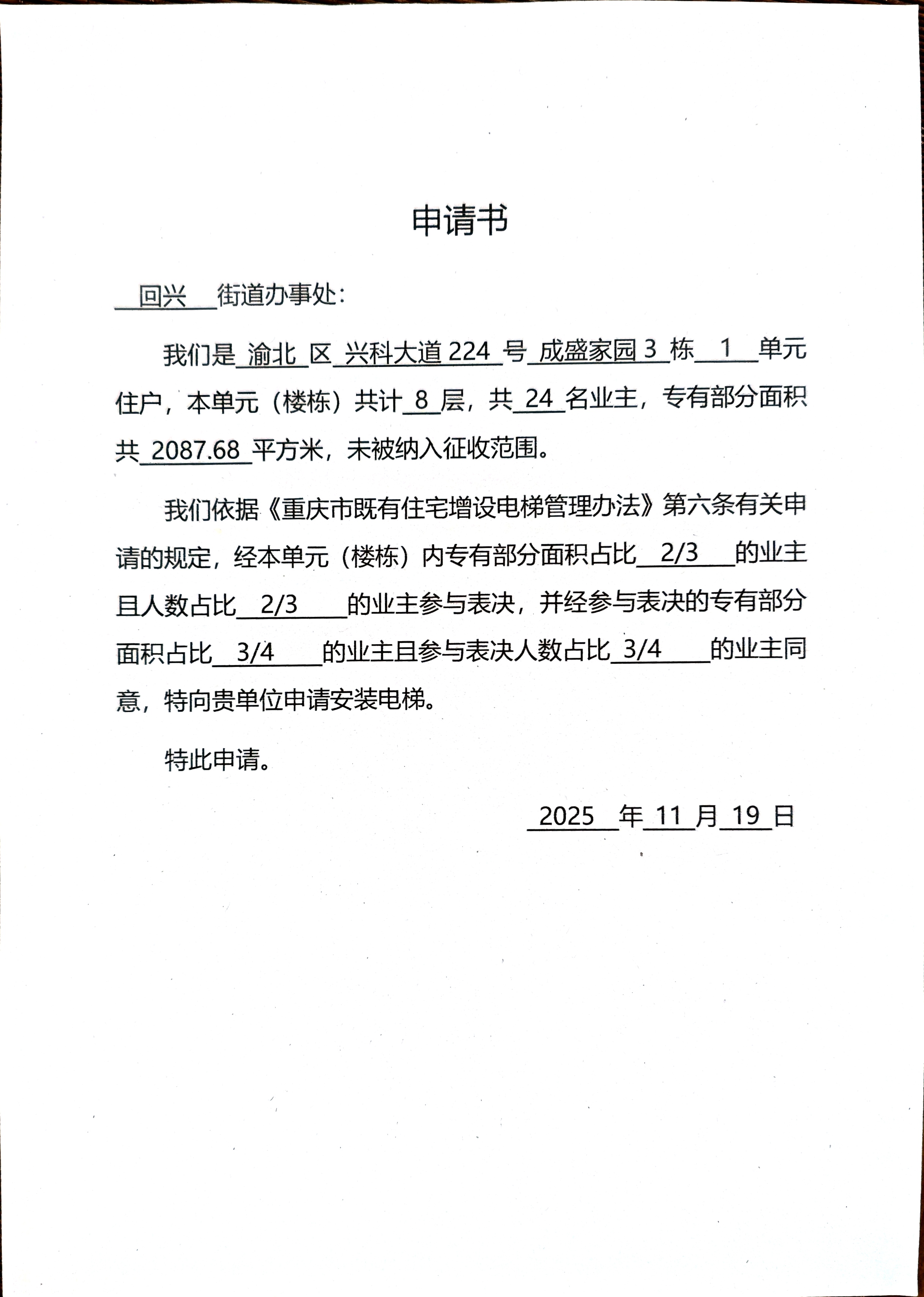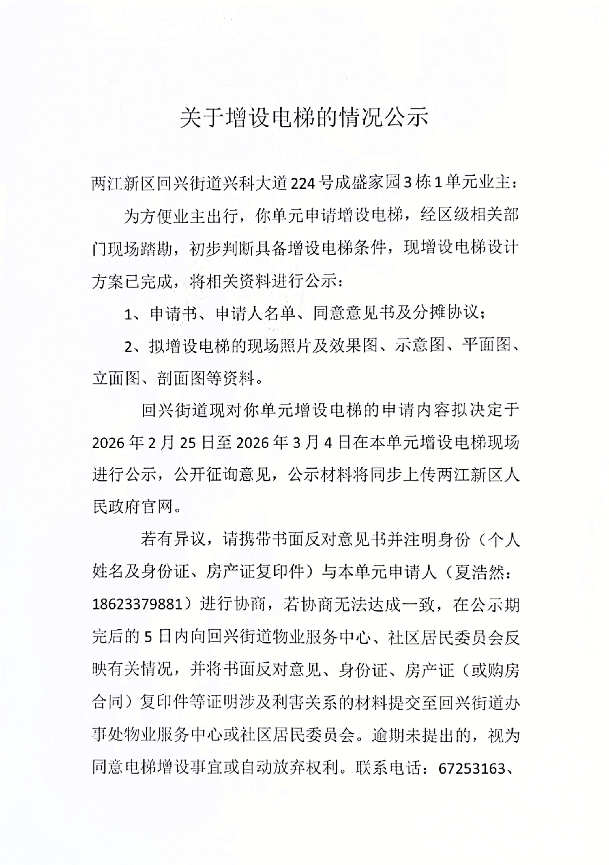 回兴街道兴科大道224号成盛家园3栋1单元增设电梯公示