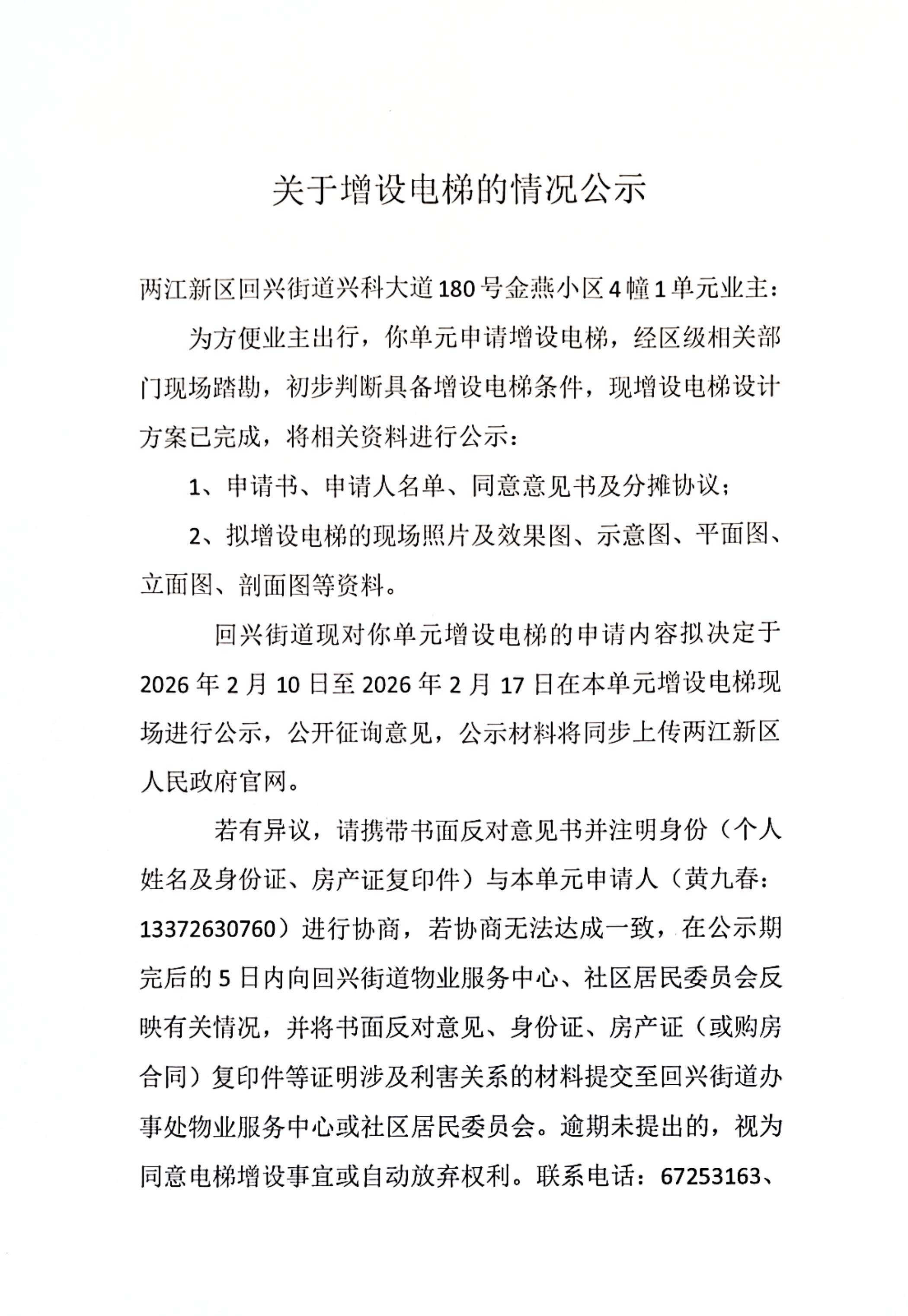 回兴街道兴科大道180号金燕小区4幢1单元电梯增设公示