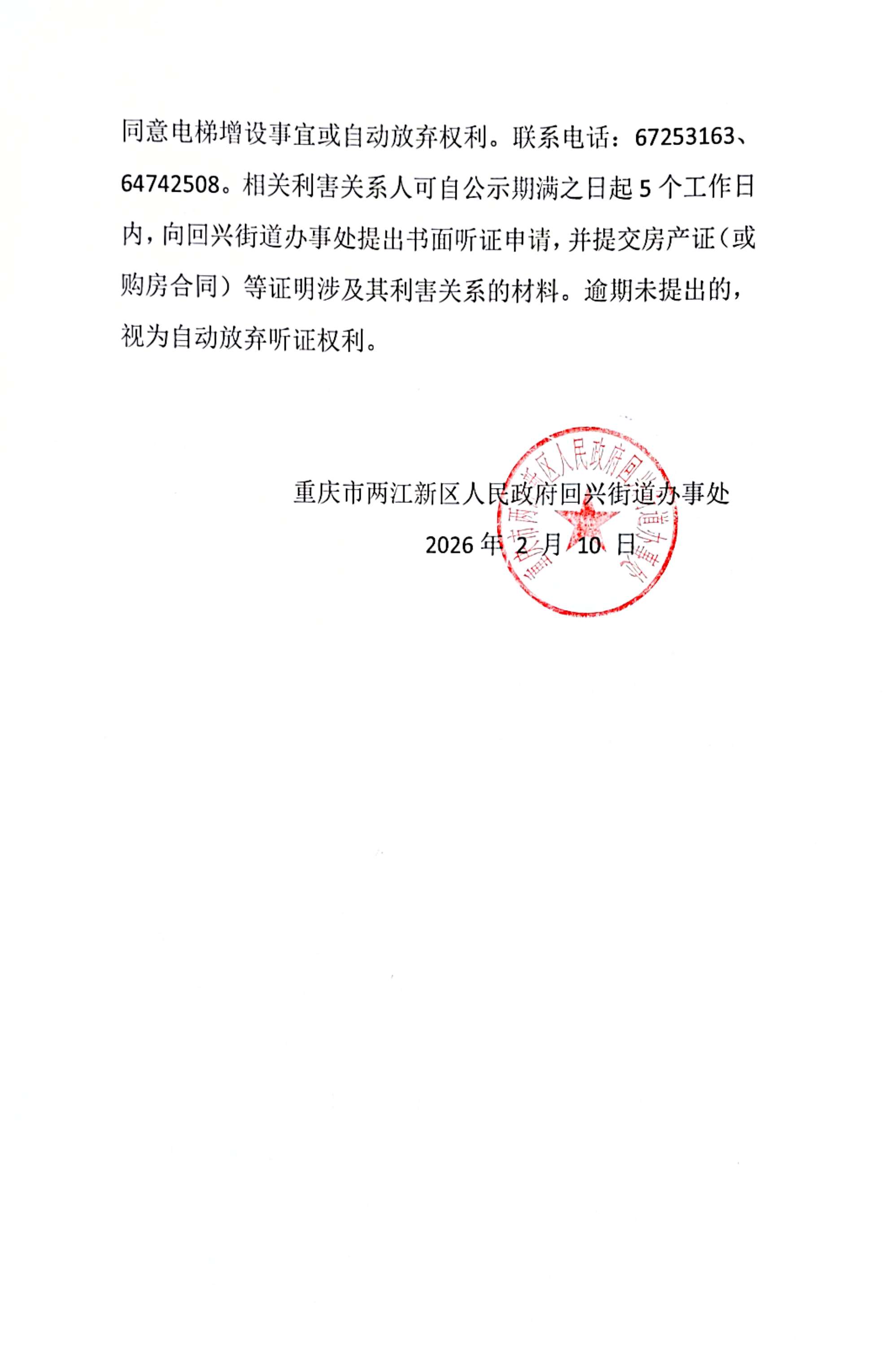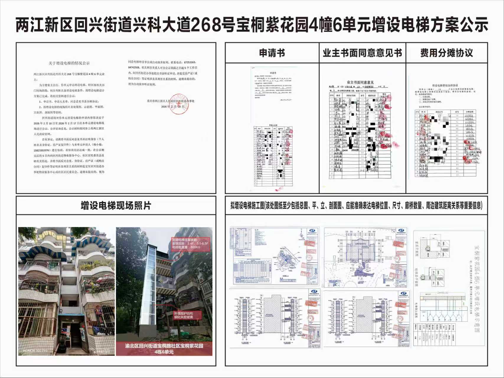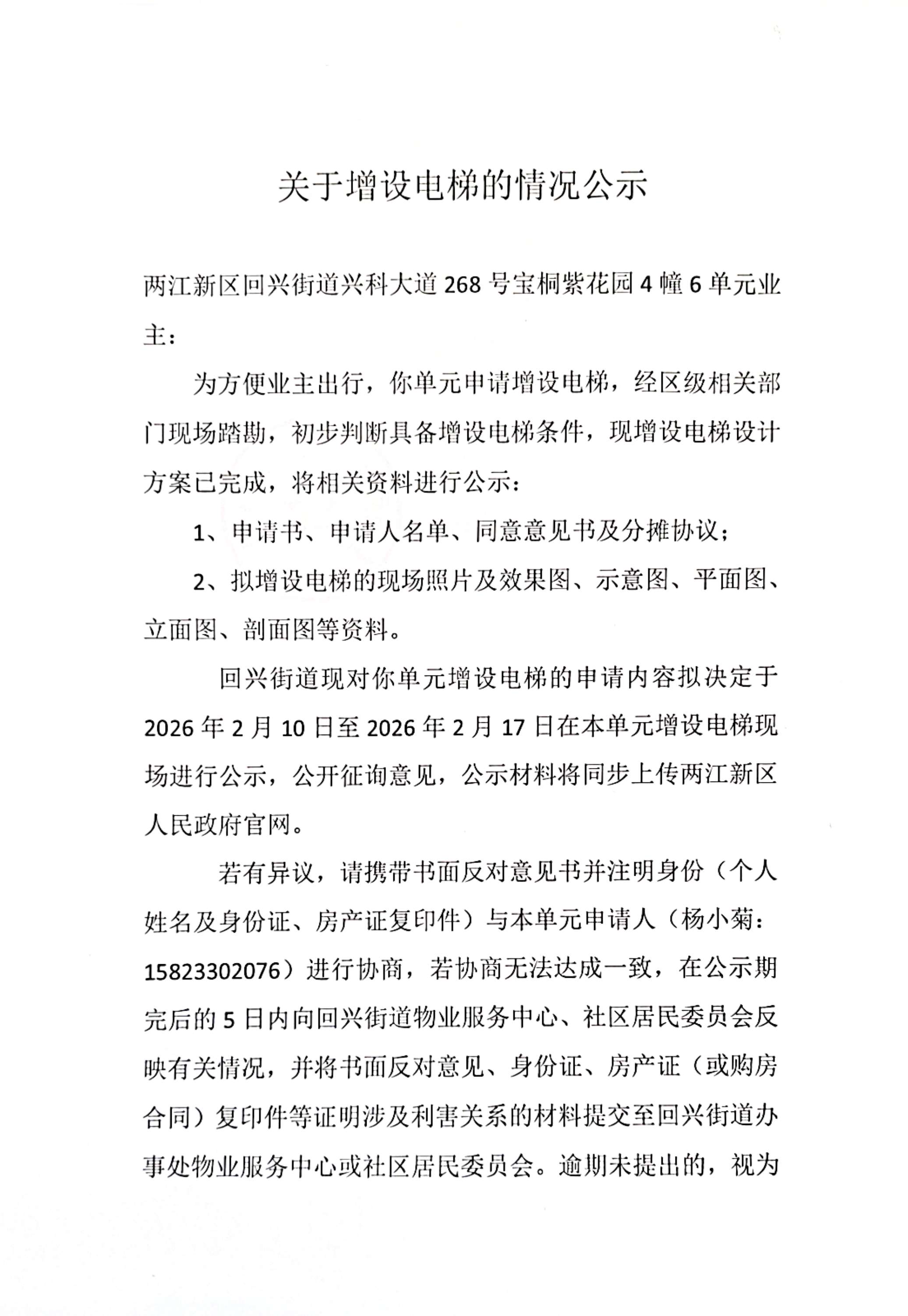 回兴街道兴科大道268号宝桐紫花园4栋6单元电梯增设公示