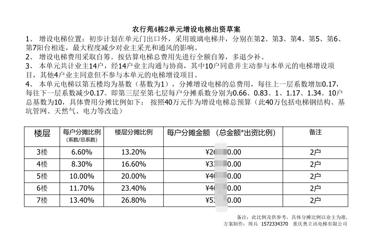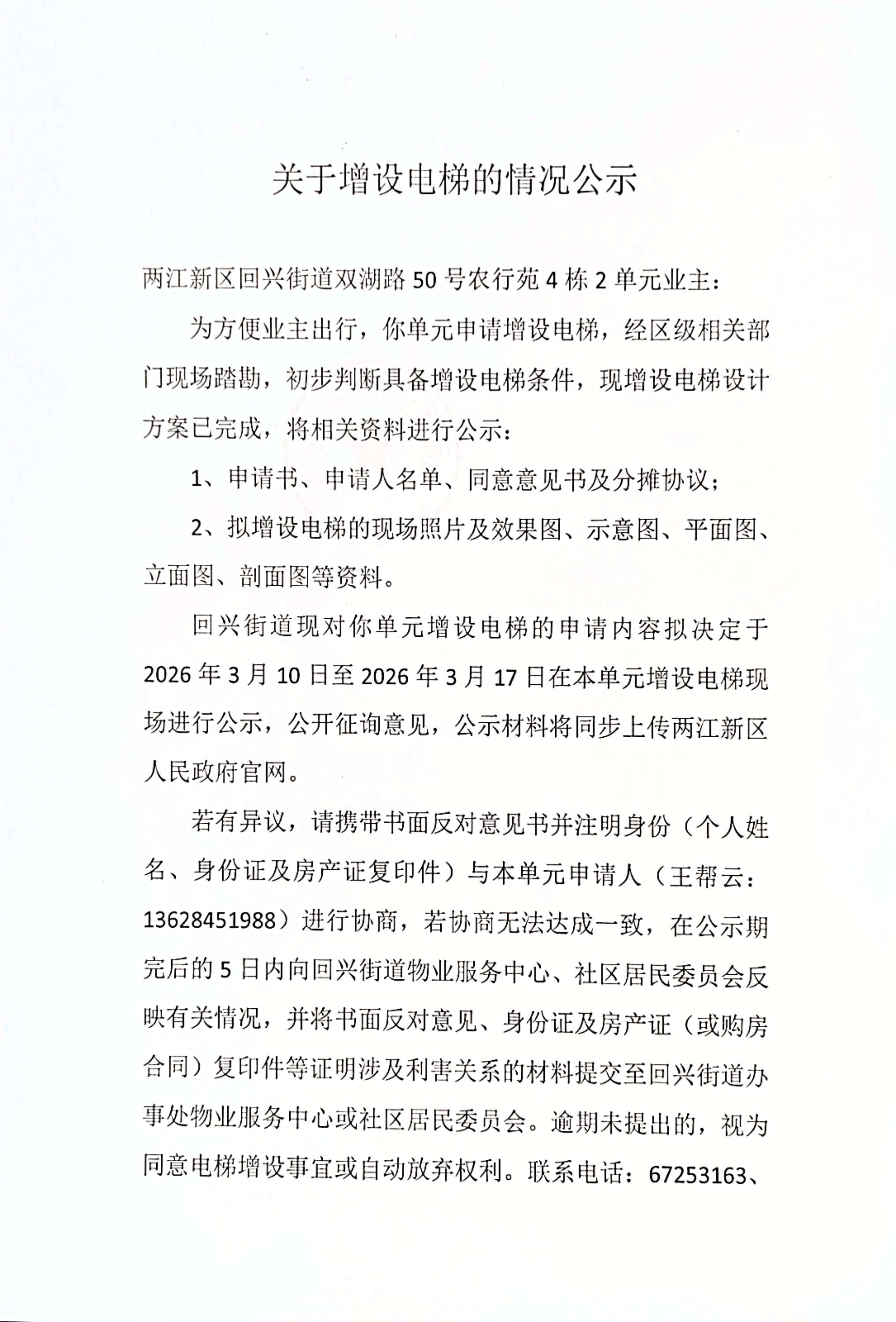 回兴街道双湖路50号农行苑4栋2单元增设电梯公示